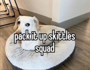 This is a homophobic meme. The “skittles squad” is a reference to skittle’s slogan, “taste the rainbow”, with the rainbow being the gay pride flag colors. The joke is the meme is the dog is telling members of the LGBTQ+ community to leave. This negatively effects the LGBTQ+ community by normalizing making fun of them through subtle memes.
