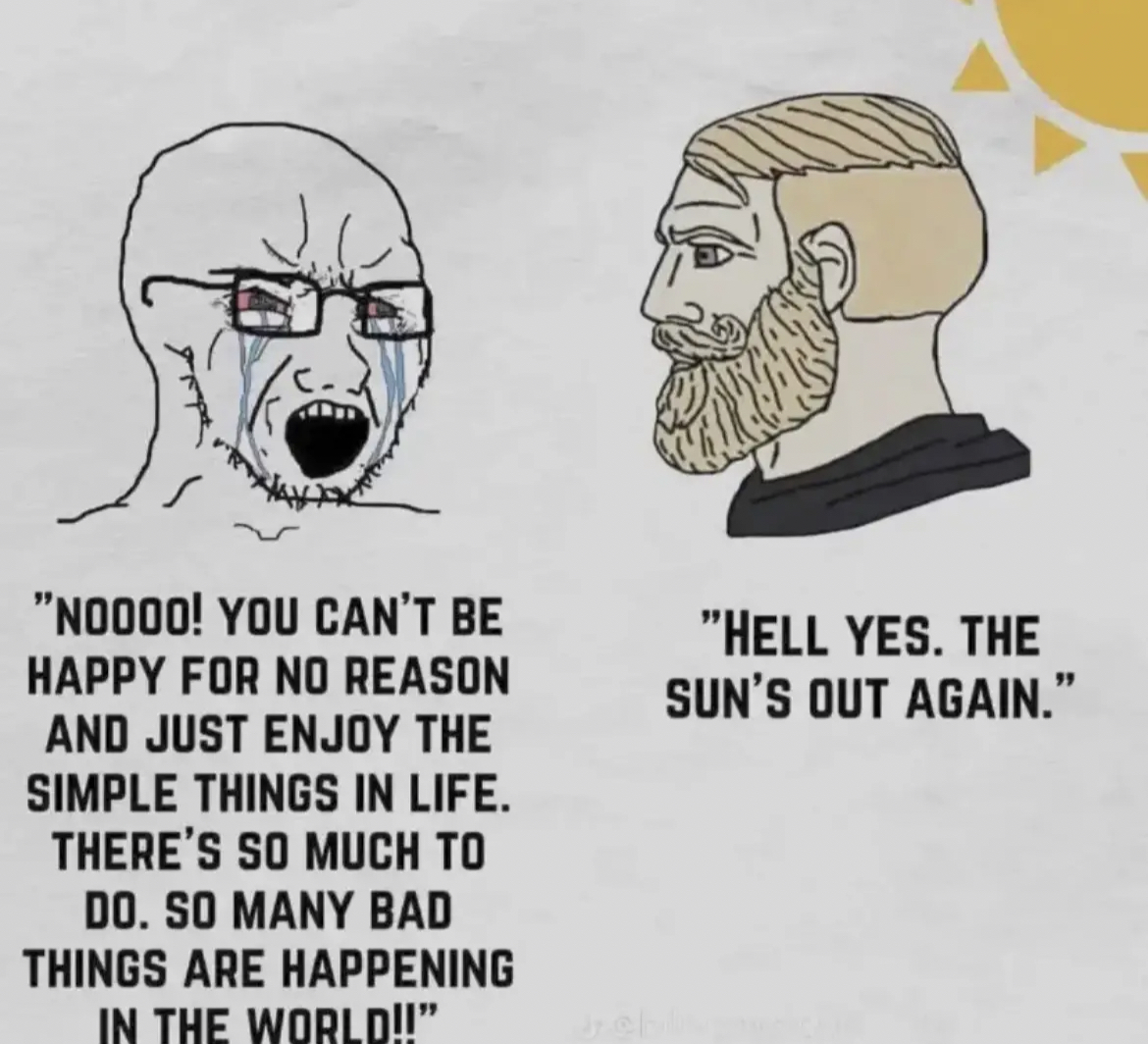 This first meme gives a good representation of what it’s like to live an everyday life as an individual in our age group. Although cynical, I believe it portrays a good message in a goofy way. Seeming how our society is based on outrage and cancelling whatever the next best (worst) thing is, i.e. Kanye West at the moment, I thought it was funny to see the polar opposite of that outrage mindset, which is of course, the ‘chad’ persona, who doesnt care, as long as it doesnt affect him. “Hell yes, the sun’s out again”, he states in blissful ignorance.