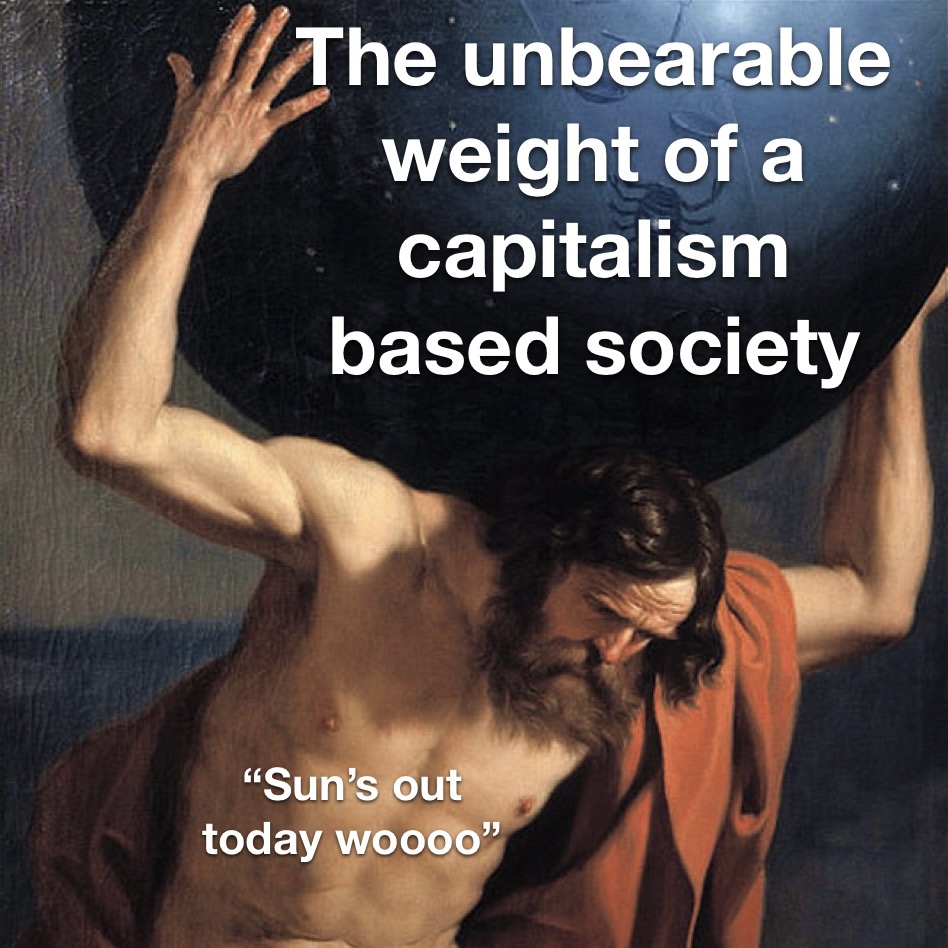 This second meme is my subtle recreation of the already simplified original. This time using the “unbearable weight of the boulder we are constantly pushing through life” template, as opposed to the Nerd/Chad template. However, I think it conveys somewhat the same message. The boulder simply being held up by the man with no other choice but to carry that weight, looking upwards and outwards, creating his own reality. “sun’s out today woooo” he again, states in blissful ignorance.
