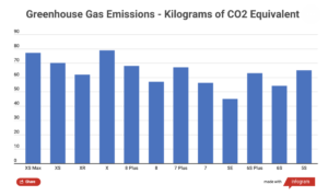 However, these are for the lowest memory options of each iteration. The biggest surprise about the iPhone CO2 emissions is the increase in emissions as the storage of the device increases. For example, the iPhone 8 with 64 GB of storage generates about 57 kg, meanwhile the iPhone 8 with 256 GB of storage generates a whopping 81 kg of emissions, which is a 42% increase in CO2 emissions for about 200 GB of storage. When we take into account the different storage options and crunch some numbers, the average CO2 emissions from the iPhone are about 80 kg of CO2 emissions (via getorchard.com). Finally, if we take this average and multiply it by the estimated amount of iPhones in Topsham, my town’s iPhones make up about 302,000 kg of CO2. Wow. Prior to this research, I wouldn’t have ever thought that my small rural town could come anywhere close to producing that much emissions from our phones.