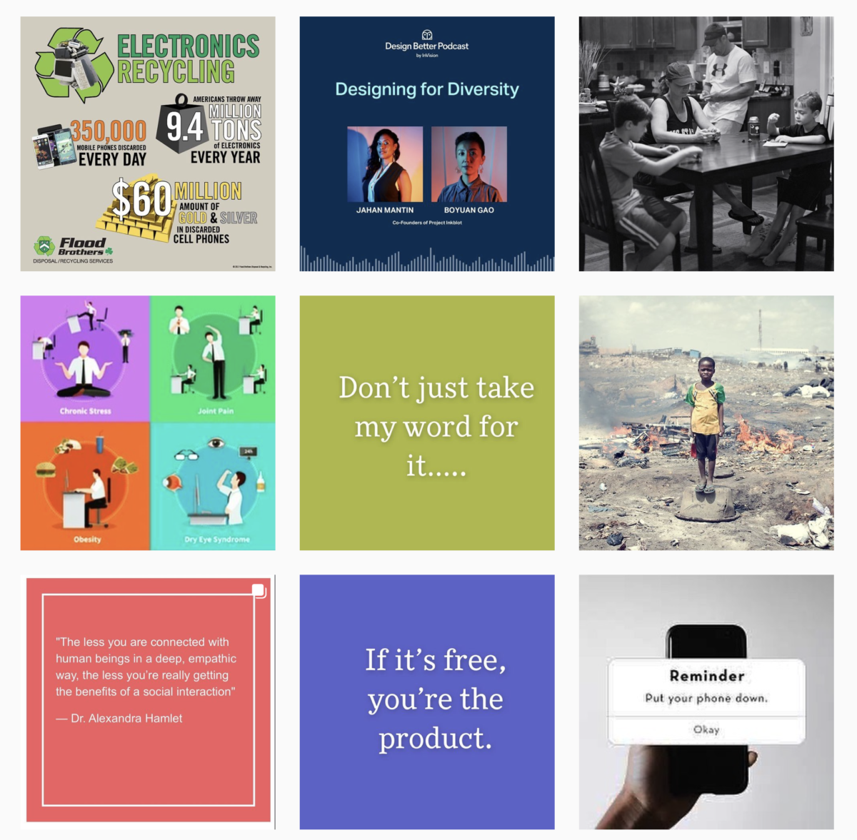 For my project, I wanted to do something to spread the word about what we have learned this semester to people outside of new media. I made an Instagram page dedicated to designing humane technology, and the effects of technology on our bodies, culture, and the earth. Everybody give it a follow!