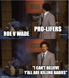 My second meme is depicting Pro-Lifers killing Roe V Wade then turning around accusing Pro-Choice people killing babies. It’s a double standard, killing something protecting people who are already functioning humans that choose to not go through with a pregnancy for reasons that are no one’s business but their own, then turning around and accusing those people of killing something that is highly dependent on the person carrying it.