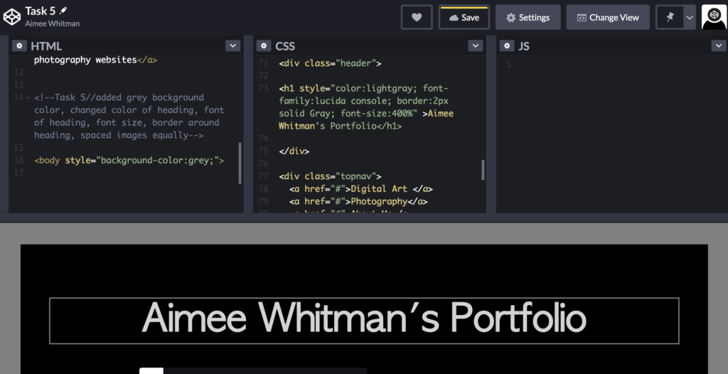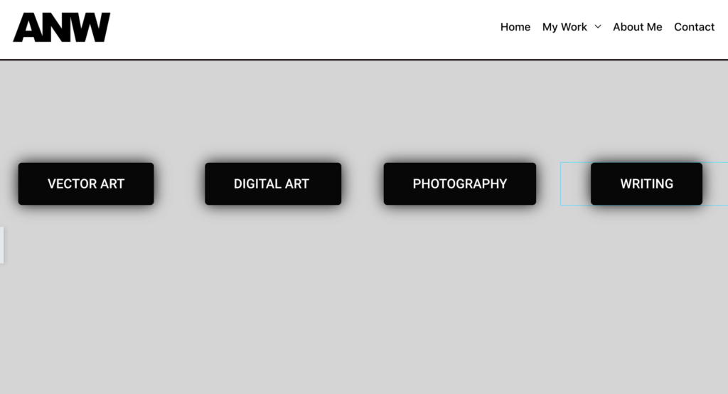 WordPress task 5. Customized theme pages to Calligraphy starter template. Added blog page to menu that leads to links to each portfolio page along with drop down menu to forward viewer directly there. Used page templates for contact and about me pages.