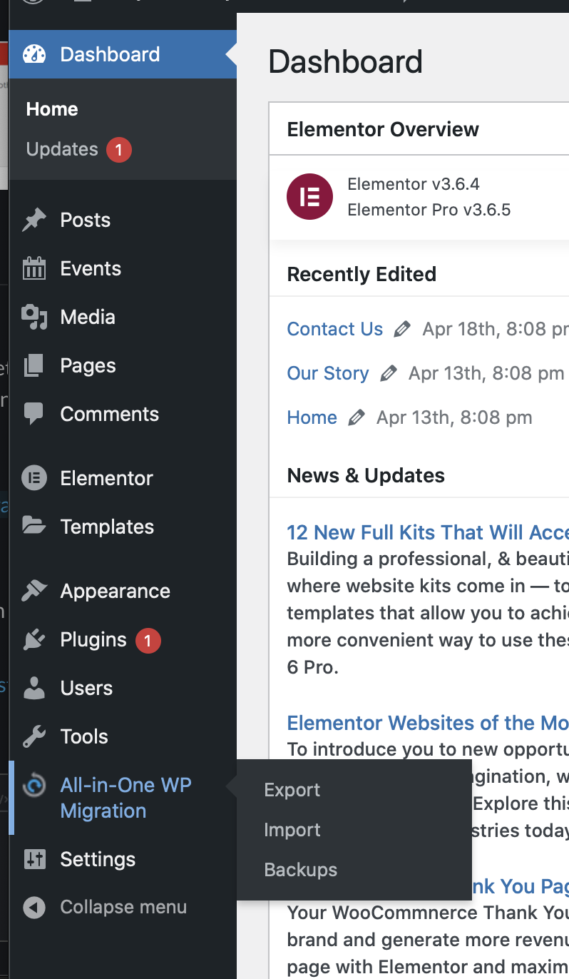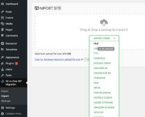 - Install the All In One WP Migration plugin plugin & Activate it on your source (local) site and on your Destination {online) WordPress site. A new All In One WP Migration plugin tab will appear in the black menu area of the Dashboard. Use this tab to do all import/exports.