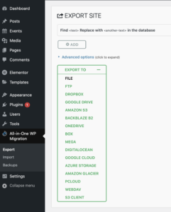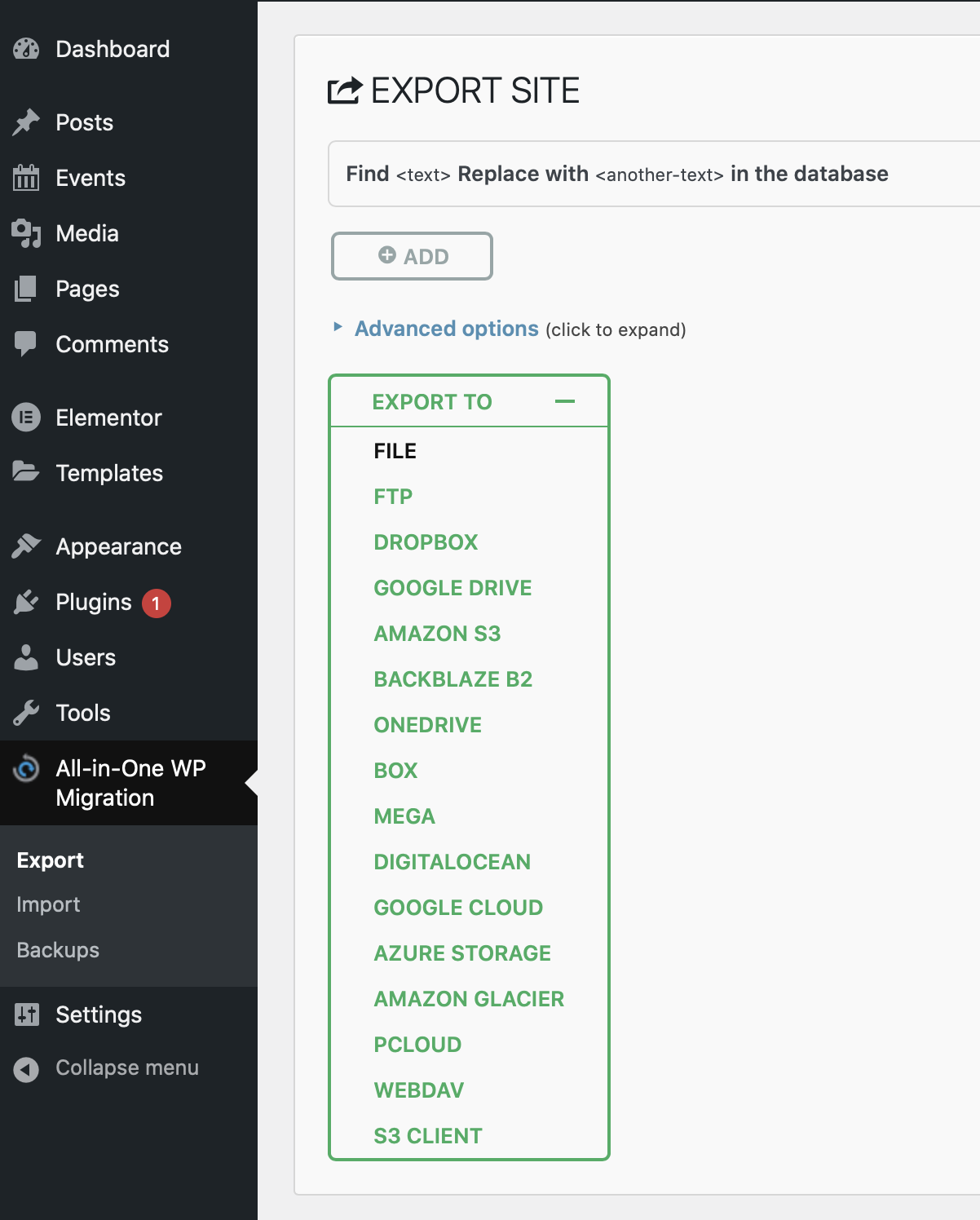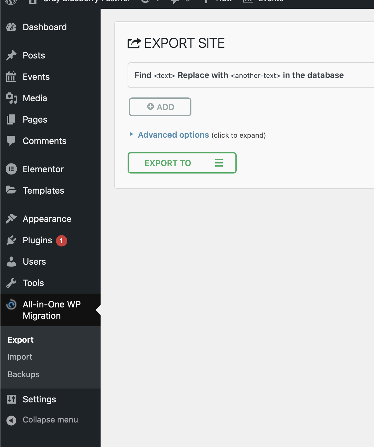 - Now export your Source (local) website via the All-in One Migration plugin with the Export To button (Ignore the ADD button . This will generate a file with extension .wpress