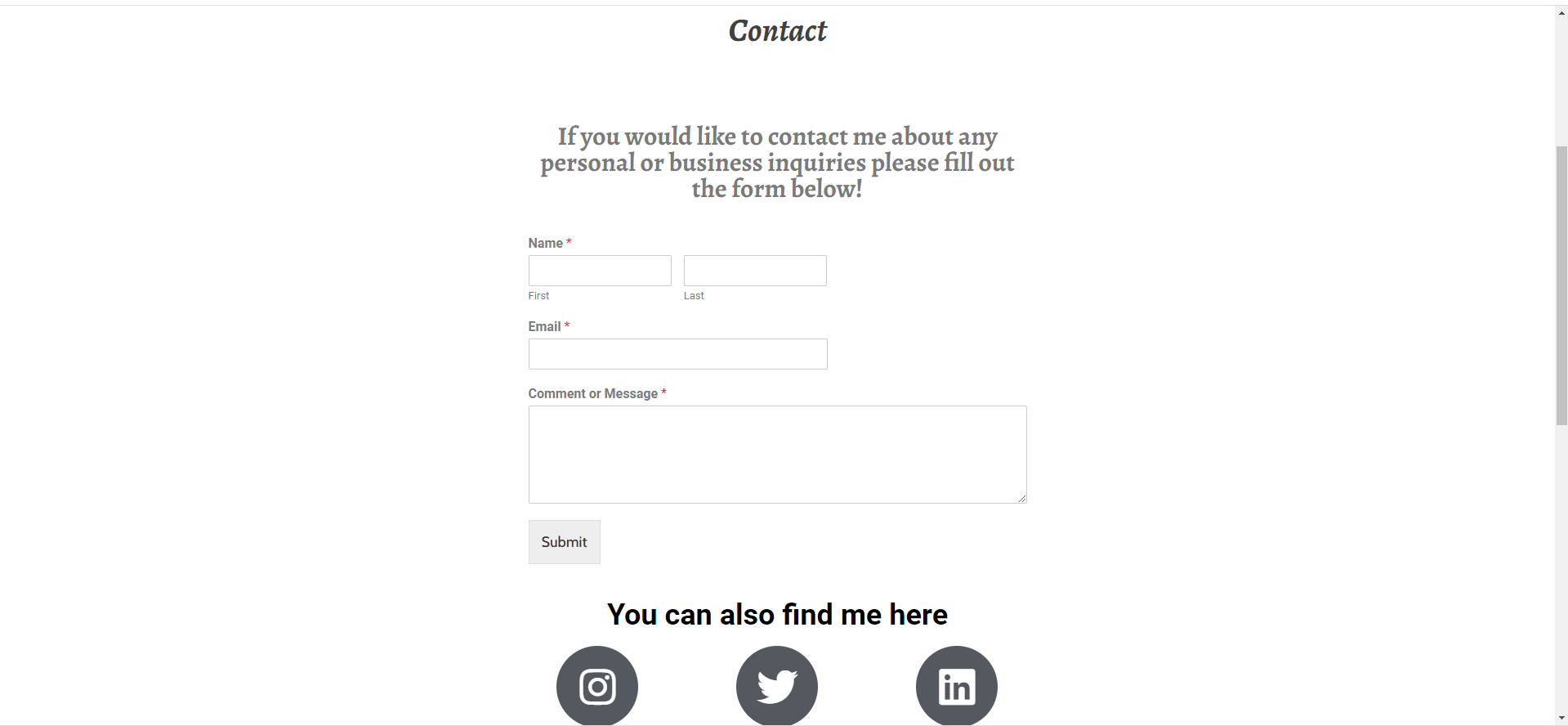 (Added my own work to the homepage and to their respective categories. I also used elementor and added socials to my contact menu to match the color theme of the site)