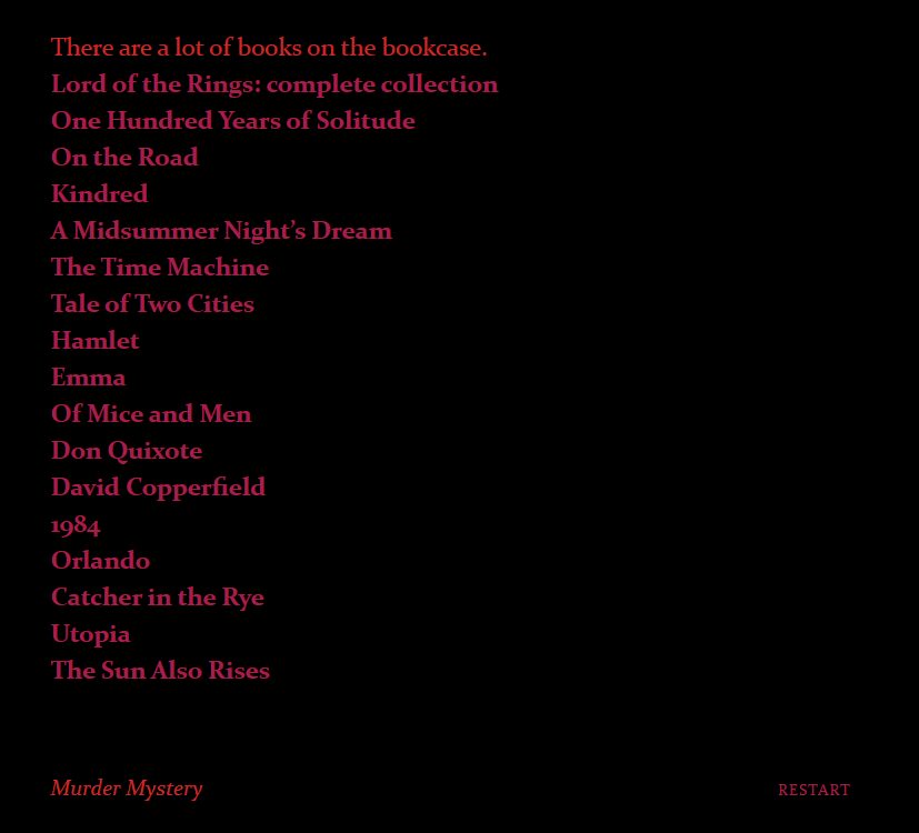 - Premise- A murder mystery where the elements of the story change depending on the reader’s choices