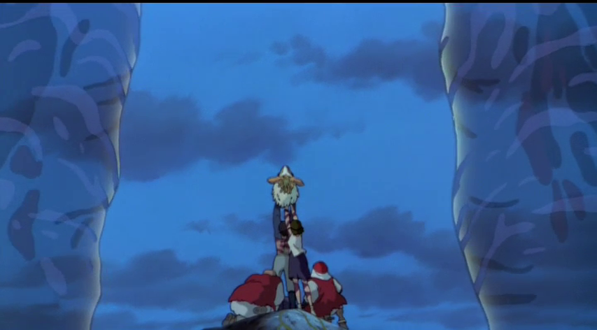This image, of Ashitaka and San returning the Forest Spirit’s head, represents the moment when the coexistence theme is most prevalent. With Ashitaka representing humans and San representing the forest, it shows how the two groups must be able to come together for the benefit of everyone. Without these two working together, both the forest and Iron Town would’ve been destroyed.