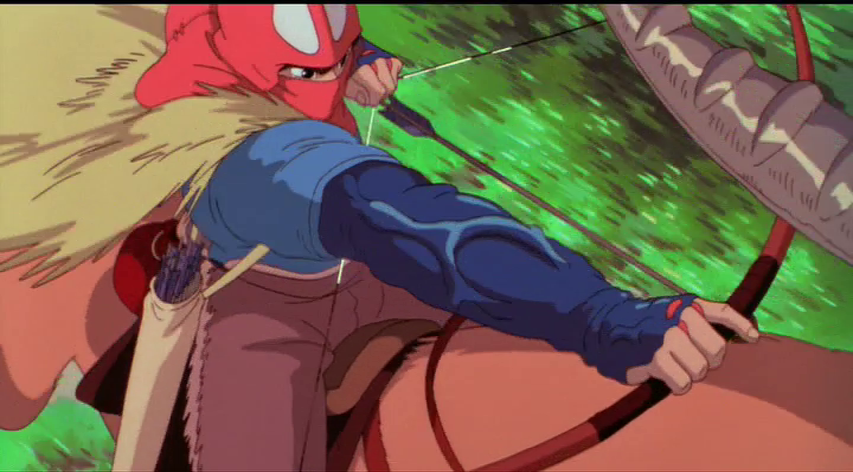 The above image shows the first time Ashitaka’s curse has an effect on him. The hatred in his arm gives him incredible strength, which causes him to shoot arrows with such ferocity that it cuts off the arms of his victim. This is the moment he realizes the pure destructive power that hatred can have, even by accident, and is the only time in the entire film he shows such unconstrained violence. After this moment, Ashitaka successfully suppresses his hatred and refuses to let it influence his actions.