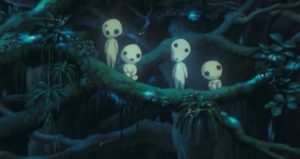There are several scenes where we can see the forest and coexistence being expressed such as when Ashitaka is on the verge of death and Princess Mononoke brings him into the forest. I feel as though this represented the human world being brought into the forest where spirits exist separately. We get to witness the Kodama come to life as Princess Mononoke walks through the forest hurriedly in order to save Ashitaka. They watch him closely and are curious, soon making their way over to examine him. Also during this scene, the fact that the forest spirit saves Ashitaka from death is showing that it knows that he is on their side in a way and knows and respects the forest, unlike the other humans that want to use it to their benefit.