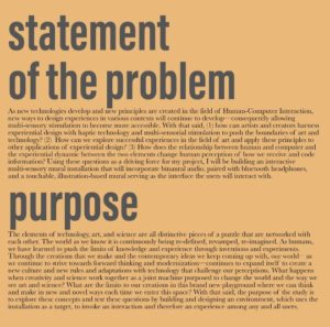 With this project, she wanted to use her skills in creative problem solving and design skills to create a user experience while using these driving forces that encompasses everything that which we, as a community, ideate and design, with the goal of advancing and modernizing our culture. By fundamentally changing the way our brain works and receives information, changing the way art and expressionism is presented and changing the way we further develop tools, using our society as a study, she aims to create and design a new way of experiencing for children at a museum setting.