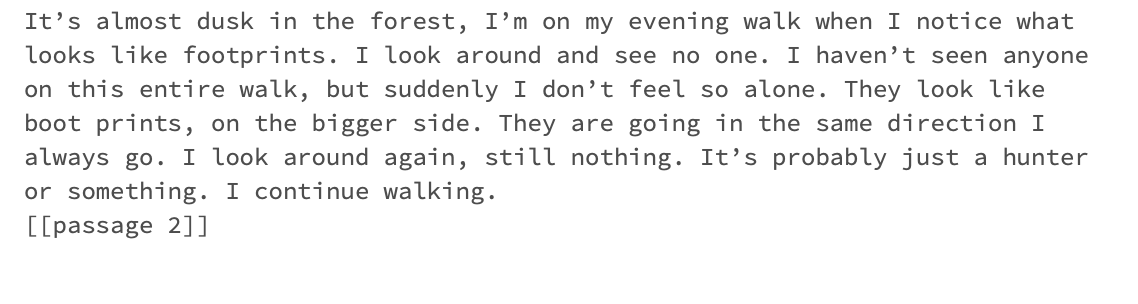 Premise: A woman finds footprints in the forest while on her daily walk, does she follow them?